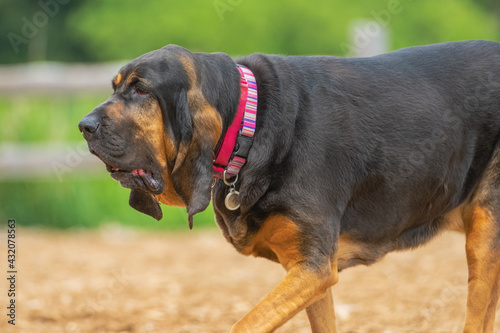 2021-05-05 A SIDE PHOTOGRAPH OF AN ELDERLY BALCK AND TAN BLOOD HOUND