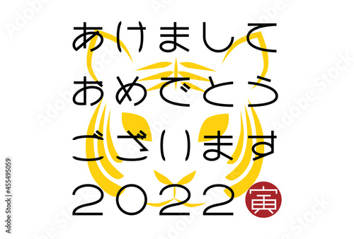 2022年寅年の年賀状イラスト: 虎の顔とタイポグラフィ