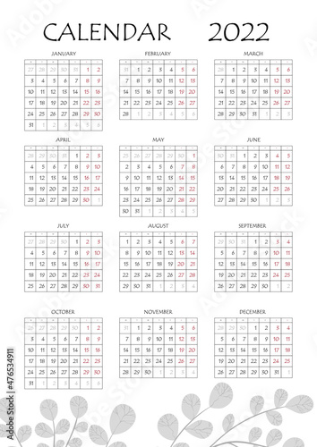 2022 calendar planner. Corporate week. Template layout, 12 months yearly, white background. Simple design for business brochure, flyer, print media, advertisement. Week starts from Monday