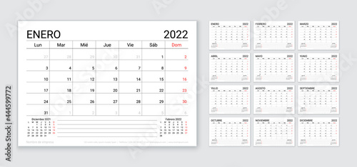 2022 Spanish calendar. Planner template. Table calender layout. Vector. Week starts Monday. Schedule grid with 12 month. Yearly stationery organizer. Horizontal monthly diary. Simple illustration.