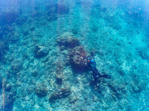 テーブルサンゴに住む可愛いフタスジリュウキュウスズメダイ(スズメダイ科)の幼魚の群れ他。 撮影するスキンダイバーもいる。 日本国静岡県伊豆半島賀茂郡南伊豆町中木から渡し船で渡るヒリゾ浜にて。 2022年10月撮影。 Reticulated Dascyllus (Dascyllus reticulatus) juvenile and others in Table Coral.