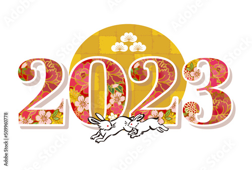 年賀状2023 親子のうさぎと金箔の月のデザイン 卯年