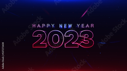 2023 Happy New Year red blue streak neon particles bokeh background new year resolution concept.