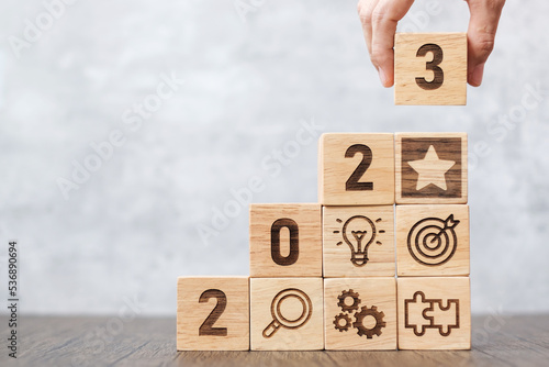 2023 wood block with business success, goal, strategy, target, mission, action, objective, teamwork, plan, idea and New Year start concept