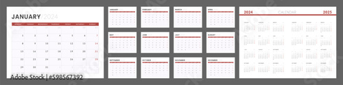 2024 - 2025 Calendar Planner Template. Vector layout of a wall or desk simple calendar with week start monday. Set of monthly and annual page calendar in minimalist corporate design for print.