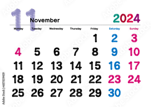 刺繍文字風の2024年11月のカレンダー 月曜始まり