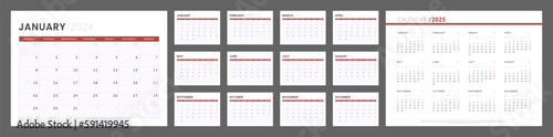 2024-2025 Calendar Planner Template. Vector layout of a wall or desk simple calendar with week start monday. Set of monthly and annual page calendar. Minimalist corporate calendar design for print.