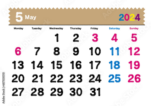 刺繍文字風の2024年5月のカレンダー 月曜始まり