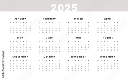 2025 Annual Calendar template. Vector layout of a wall or desk simple calendar with week start Monday. Calendar design in black and white colors