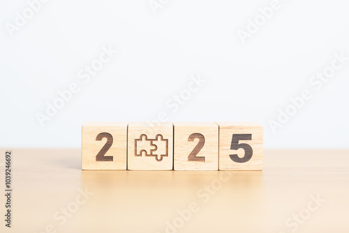 2025 block with jigsaw puzzle icon. Business Process, Team, teamwork, Goal, mission, Resolution, strategy, plan, Action, partnership, and New Year start