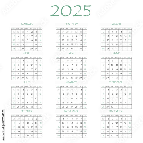 2025 calendar planner. Corporate week. Template layout, 12 months yearly, white background. Simple design for business brochure, flyer, print media, advertisement. Week starts from Monday.