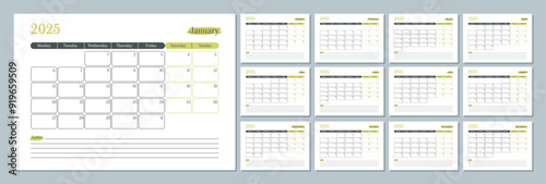 2025 calendar template. Monthly planner diary. The week starts on Monday. Set of 12 months pages.