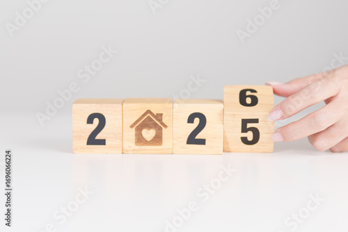 2025 end year to Happy New Year 2026 with Home and Heart block. Property investment, House Mortgage, Real Estate tax, homeless, donation, Financial and happy family concepts