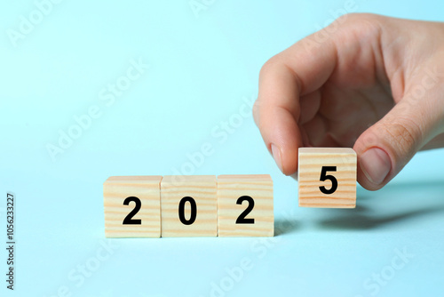 2025 New Year. Woman putting wooden cube with number 5 on light blue background, closeup