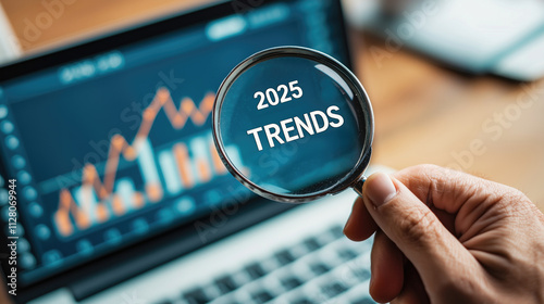 2025 Trends concept. A businessman presents 2025 TRENDS globe surrounded, e-commerce, finance, healthcare, online work, media, technology and green business, generative ai