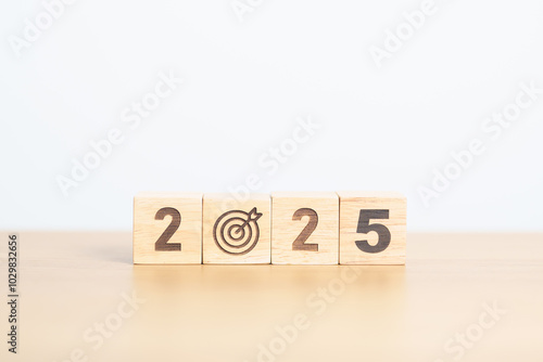 2025 year block with dartboard icon. Goal, Target, Resolution, strategy, plan, Action, mission, motivation, and New Year start concepts