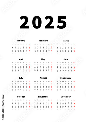 2025 year simple vertical calendar in english language, typographic calendar isolated on white