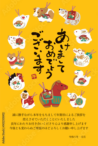 2026年 午年の年賀状 年賀状じまいのデザイン 馬と十二支の土鈴イラスト