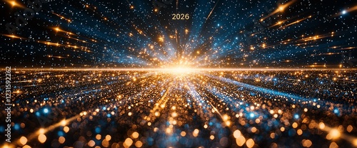 2026 Abstract glowing light streaks and particles burst from a central point, creating a dynamic and energetic composition.