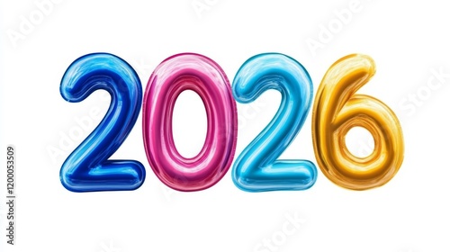 2026, Bright, Colorful, Multicolored Balloon Numbers Floating on White Background, Isolated, Party