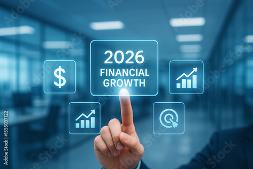 2026 financial growth dashboard with business hand touching digital interface icons in modern office, concept of future investment strategy, profit planning, and corporate analytics