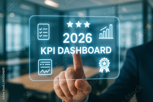 2026 KPI dashboard interface with business hand selecting virtual performance icons, concept of corporate analytics, goal tracking, and business metrics visualization in modern office