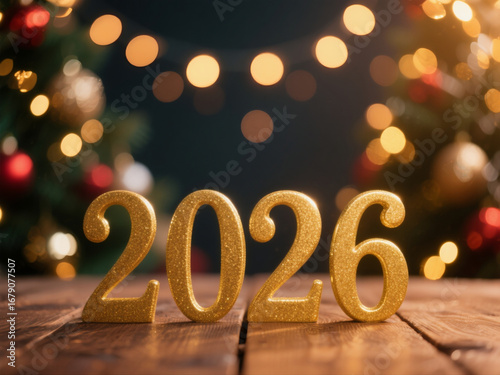 2026 New Year Celebration. Golden 2026 Number on wooden table, with bokeh lights in the background. New Year's Eve Celebration. Christmas is the celebration season. holiday.