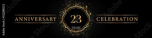 23 years golden anniversary celebration logo. Poster Design for anniversary event party, wedding, birthday party, ceremony, congratulation, greetings and invitation card. Gold Glitter Vector.