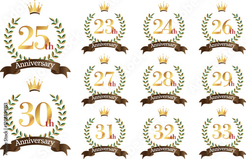 23~33周年イラスト 月桂樹の葉と王冠と茶色いリボンのマーク アイコンセット