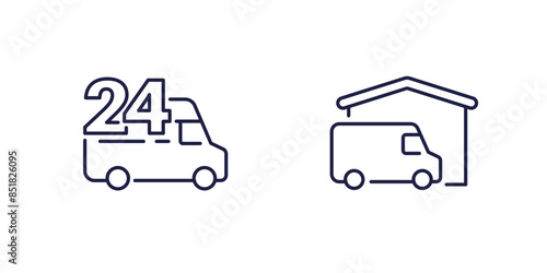 24 hours delivery icons with vans, line vector