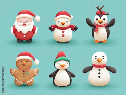 2408 26.A festive vector banner set featuring a cute collection of Christmas characters including Santa Claus, a smiling gingerbread man, a jolly snowman, a playful reindeer, a cheerful penguin, and