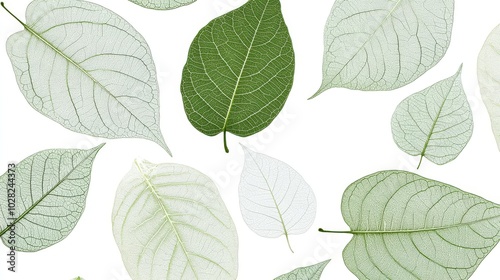 2408 64.A collection of flat green leaves illustrated with fine details, showing the veins and textures of each leaf. The white background highlights the natural simplicity and beauty of the leaves,
