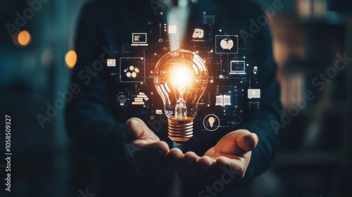 2410 34.A glowing light bulb held by a businessman, with virtual ebook icons and digital symbols surrounding him. The soft glow from the light bulb and the digital interface creates a futuristic
