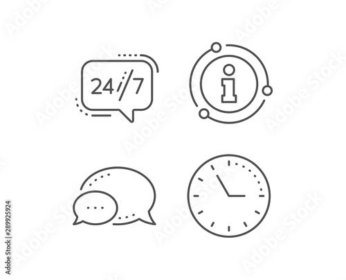 24/7 service line icon. Chat bubble, info sign elements. Call support sign. Feedback chat symbol. Linear 24/7 service outline icon. Information bubble. Vector