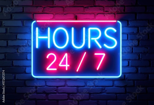24/7 service neon sign on brick wall for business or advertising design