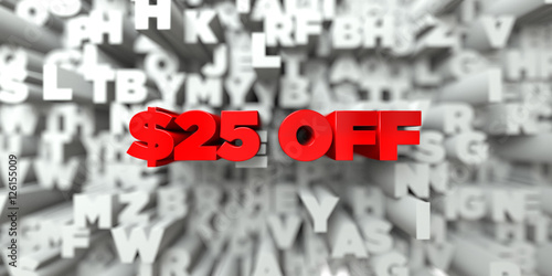 $25 OFF - Red text on typography background - 3D rendered royalty free stock image. This image can be used for an online website banner ad or a print postcard.