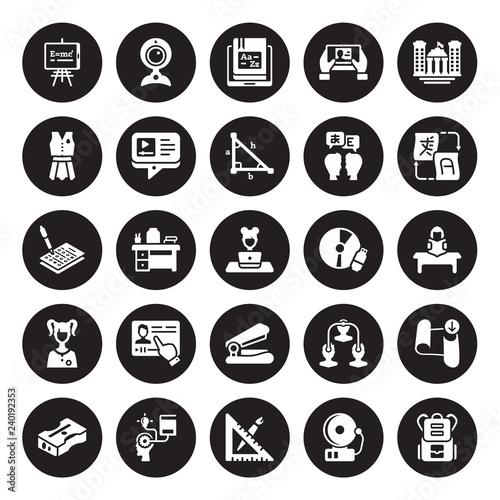 25 vector icon set : Whiteboard, School bell, material, self-learning, Sharpener, Translation, Study tools, Stapler, Student, Uniform, Vocabulary, Web camera isolated on black background.