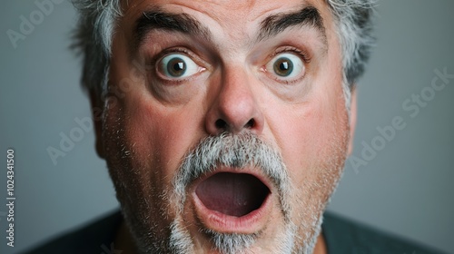 27. A middle-aged man with a shocked expression, eyebrows raised and mouth open in disbelief, against a soft gray background.