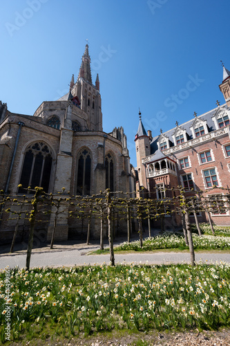 27 April 2021, Bruges, Belgium, walking on medieval Bruges streets in sunny day, travel destination