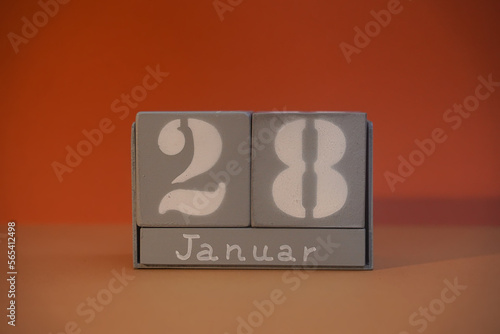 28 Januar on wooden grey cubes. Calendar cube date 28 January. Concept of date. Copy space for text or event. Educational cubes. Cube shape calendar for January 28