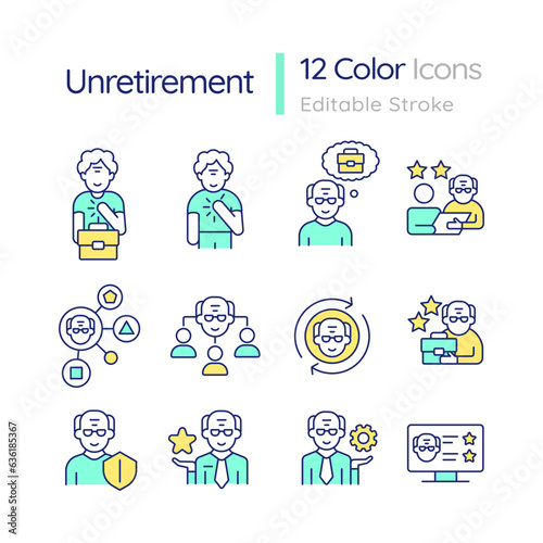 2D editable multicolor thin line icons set representing unretirement, isolated vector, linear illustration.