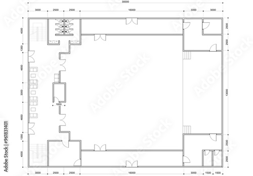 2D top view floor plan of an aula or multipurpose room with notations, for interior reference of the same building type