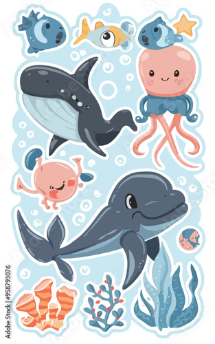 2d vector illustration colorful cute sea fish whale and dolphin pattern