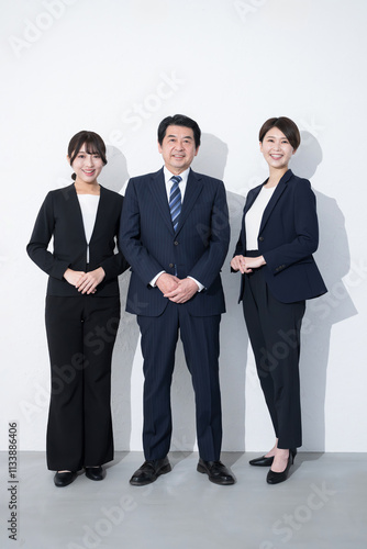 ビジネススーツで複数(3人)笑顔のイメージのカメラ目線 白背景の全身