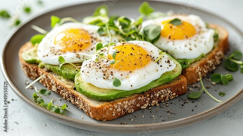 3. Avocado toast garnished with microgreens and poached eggs, nutrient-rich breakfast, healthy eating concept.