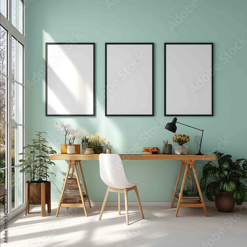3 blank framed posters hanging on light turquoise wall beautiful and modern wooden desk a white chair plants on the side of the table a black lamp a white flo