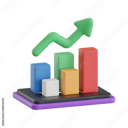 3 D bar chart with upward trending green arrow and colorful bars transparent background isolated on a transparent background