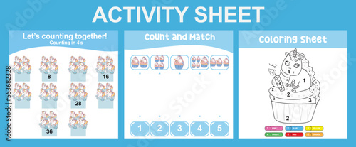 3 in 1 Activity Sheet for children. Educational printable worksheet for preschool. Coloring and counting activity. Vector illustrations.