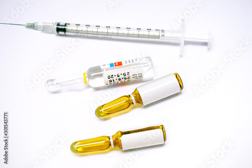 3 ml. brown Ampules of drug and plastic syringe on white background.