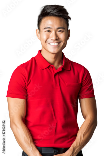 30-year-old Asian man in a red polo shirt as job uniform, smiling warmly